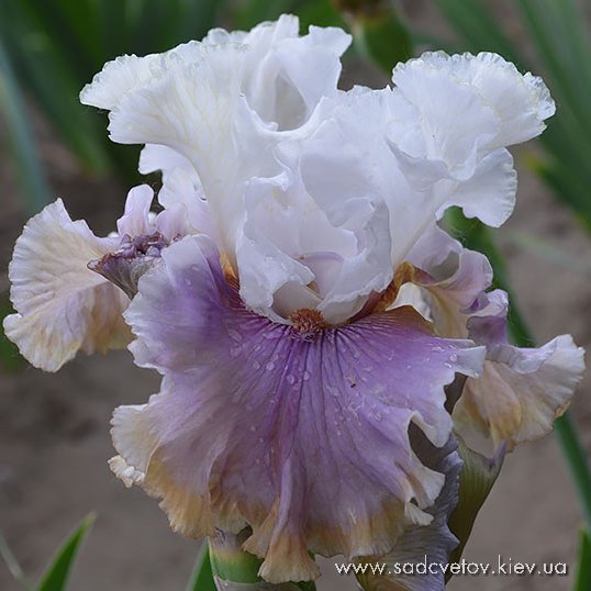 Велика, добре гофрована квітка. Ст. - білі з легким розгалуженням золотистих прожилок і тонкою золотистою облямівкою по краю, ф. - світло-фіолетові з золотистою окресленої коричневим облямівкою по формі серпа знизу фол, з білим краєм з боків і золотистими плечима, візерунок білих прожилок з боків від помірної оранжевої в кінчиках б.
