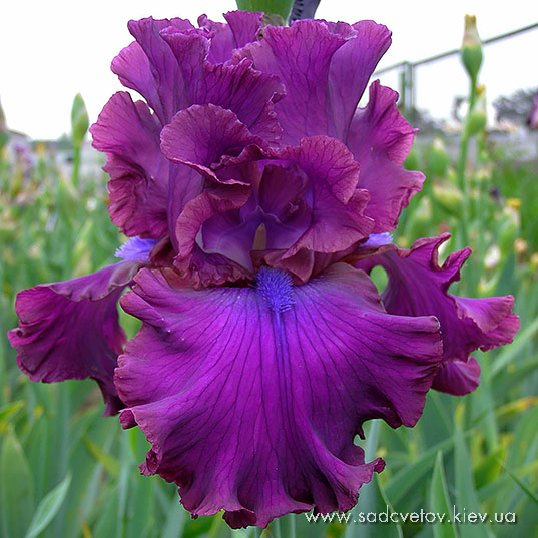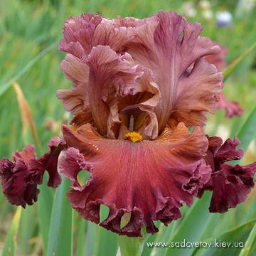 Злегка мереживна однотонна гофрована квітка. Помірно пурпурні ст., Темно-червоні ф. з висвітленням до кольору стандартів, малюнок білих переривчастих прожилок з боків від коричнево-оранжевої б.