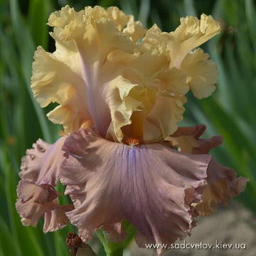 Велика гофрована квітка. Ст. - світлий абрикосовий з рожевим персиковим рум’янцем. Гілки маточки - такі як стандарти. Ф. - світлий рожево-бєжевий з широкою каймою кольору стандартів та невеличким білим візерунком прожилок з боків від бороди. Б. - приглушений насичений помаранчевий по білій основі.