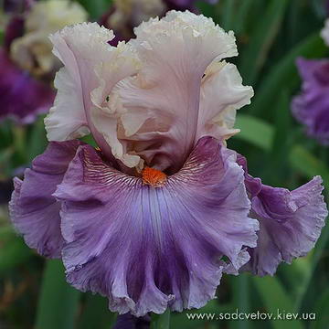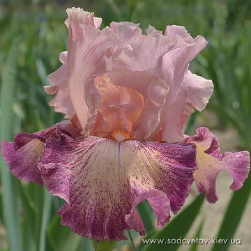 Гофрована і мереживна квітка. Ст. - бежеві блідо-рожеві з лавандовим рум'янцем в середніх прожилках, по бузковому фону фолів від плечей і на відстані навколо яскравих червоно-мандаринових борід розмите гало пурпурно-рожевого кольору, поруч з борідкою візерунок з рожевих прожилок