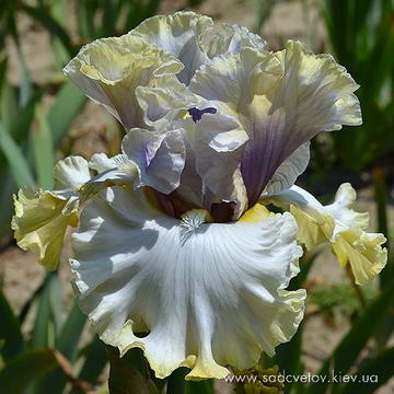 Реверсивно забарвлена прекрасно гофрована квітка. Ст. - блакитно-біла основа з блідими оливковими включеннями і прожилками у верхній частині і вираженим темним віялом прожилок помірного пурпурно-рожевого в нижній. Ф. - білі з вираженими темними прожилками і плечима світлого зеленувато-жовтого і такою же тильною стороною фол. Яскраво-жовті з білим кінцем б.