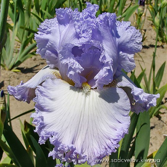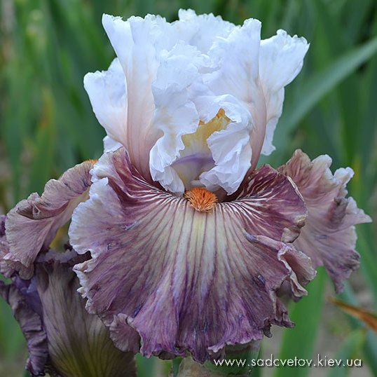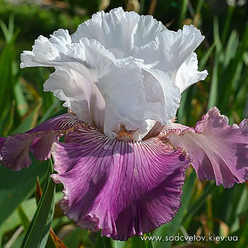 Прекрасно гофрована квітка. Ст. - льодово-білі зі слабким лавандовим рум'янцем в середніх жилках. Ф. - по дуже світлій пурпурно-блакитній основі рясний водоспад світло-фіолетових прожилок що не доступать до краю і створюють облямівку 1/5", пурпурно-червоний в плечах і льодово-білий по боках від мандаринової б.