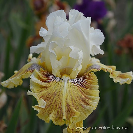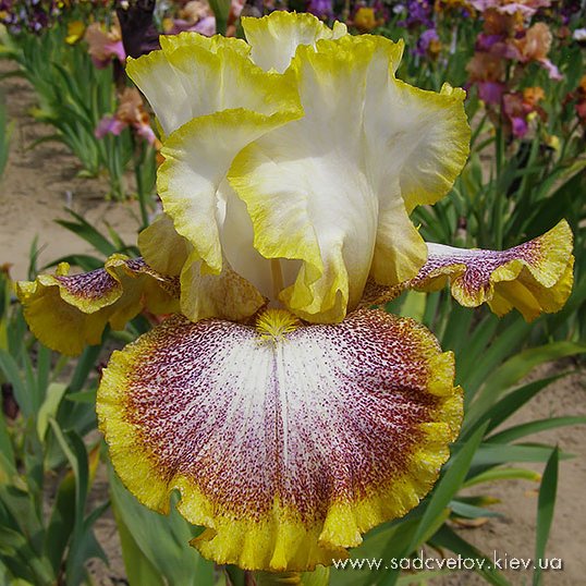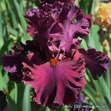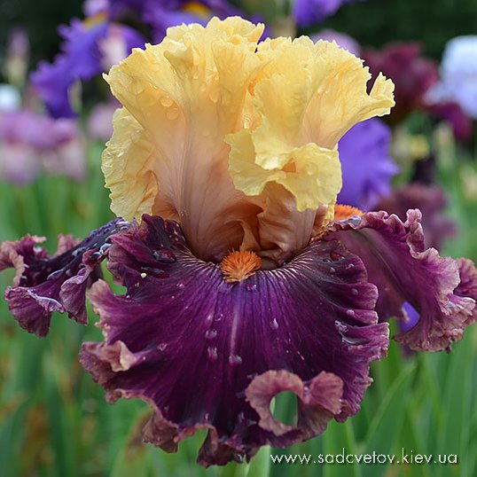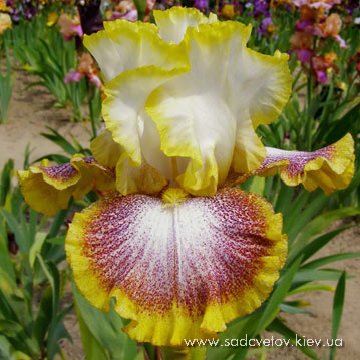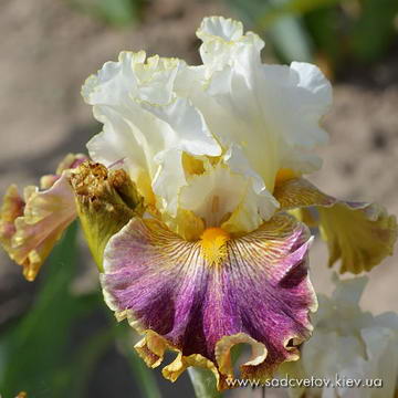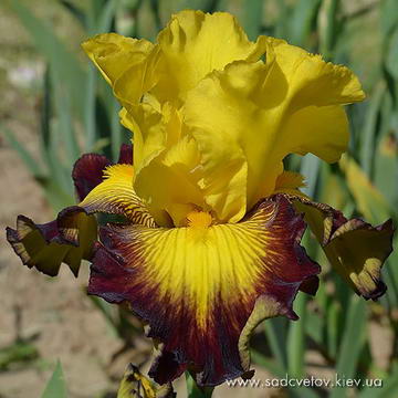 Добре гофрована квітка. Ст. - світлий пурпурний, серединка як стандарти з золотистими включеннями, ф. - яскравий червоно-пурпурний з сяйвом яскравого пурпурного під бородою, візерунком білих і жовтих прожилок з боків від бороди і облямівкою кольору стандартів, б. - блискучий жовтий з сірувато білим.