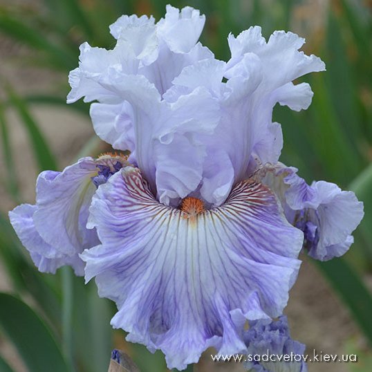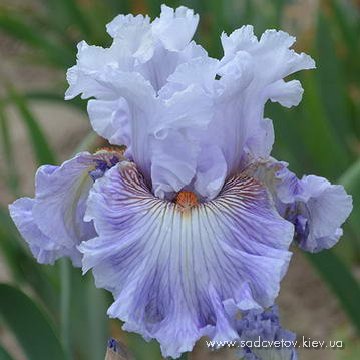 Прекрасний, супергофрований, мереживний, лавандово-синій. Фоли з висвітленням в середині під бородою, з лавандово-білим візерунком в плечах. Б. - помірно-оранжева з висвітленим кінцем.