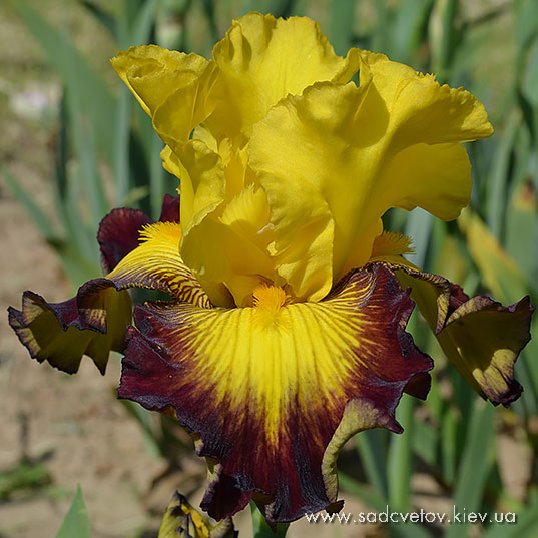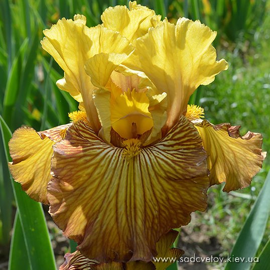 Добре гофрована квітка. Ст. - помірний жовтий з коричневими прожилками по гофрованим краях і світлий зеленувато-жовтий рум'янець в середині, серединка - віяло помірних червонувато-коричневих прожилок по абрикосовому фону, ф. - темний червоний з візерунком білих прожилок з боків від борідки, б. - тигрові смугасті ворсинки: низка темного оранжево-жовтого з темно червоним.