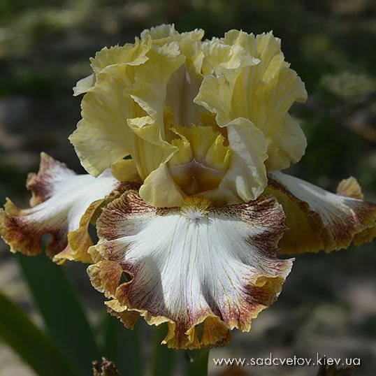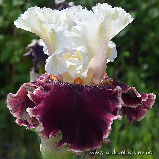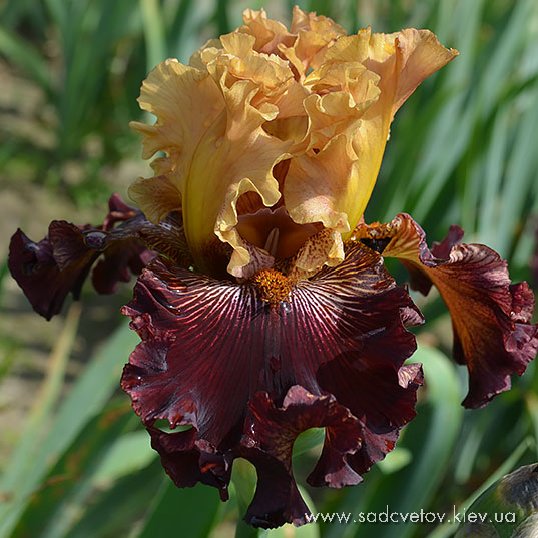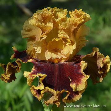 Супергофрована, мереживна квітка. Ст. - Світлого золотисто-коричневого кольору з зелено-жовтим стрижнем в срежніх жилках. Серединка мереживна з золотисто-жовтими кінчиками. Ф. - темні бордові, більш червоні з боків з широкою 1/4" світлою золотисто коричневою облямівкою по краю і невеликою люмінатою білих прожилок від бороди і жовтих в плечах. Б. - оранжеві з більш жовтим кінцем.