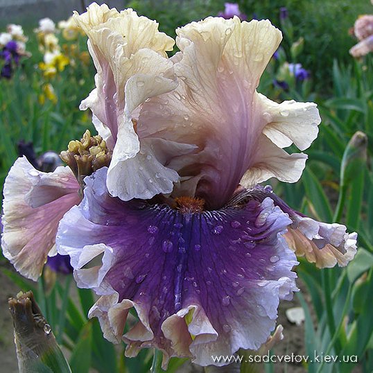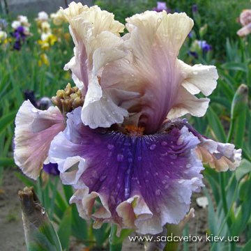 Широка паруюча квітка повна гофр. Світлі устрично-кремові ст. , Ф. з фіолетово-червоним переливом і бузково-кремовою облямівкою. Сильний солодкий аромат!