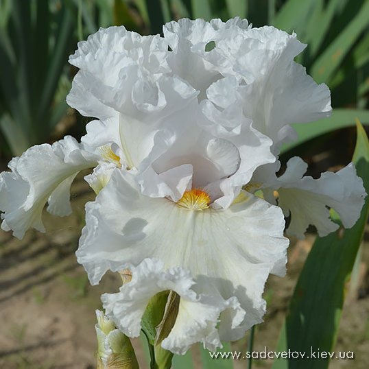 Дуже гофрована сніжно-біла квітка. Ст. - з гірчичним стрижнем в середніх прожилках. Б. - яскравий оранжево-червоний з жовтим кінцем.
