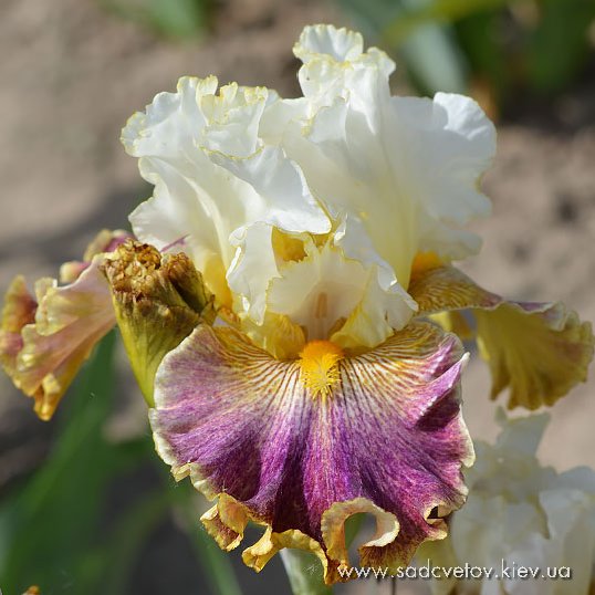 Добре гофрована квітка. Ст. - білий з золотисто-лавандовим рум'янцем, ф. - пліката, устрично-гірчична серединка в ореолі червоно-коричневих і фіолетових прожилок, невелика люміната світлих білих прожилок з боків бороди і тонке висвітлення кольору по краю фолів, б. - помірний оранжевий з устричних-гірчичним кінцем.