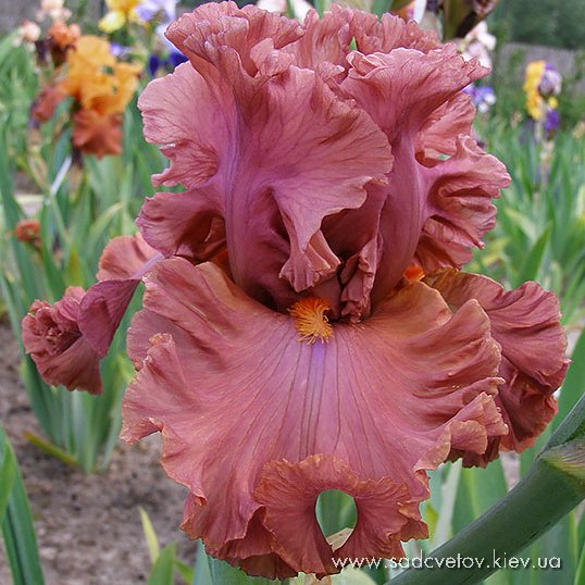 Це ірис вищої якості з прекрасним гофруванням і формою. Чудовий колір теракотової сієни з невеликим лавандовим спалахом нижче яскраво апельсиново-мандаринової б ..