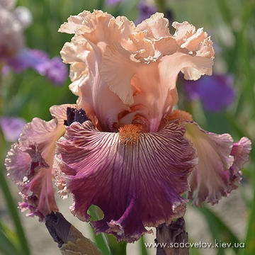 Добре гофрована квітка. Ст. - світло-абрикосовий в основі з персиковим рум'янцем, ф. - темний червоно-пурпурний з висвітленням кольору до блідого пурпурно-рожевого по краю, невеликим візерунком білих прожилок з боків і яскравим пурпуровим висвітленням знизу яскраво оранжевої бороди.